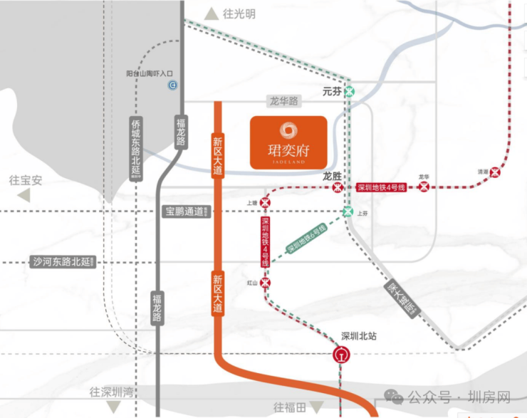项目紧靠4号线龙胜站,周边有地铁4/5/6号线,以及新区大道、福龙路快速路等多条主干道。