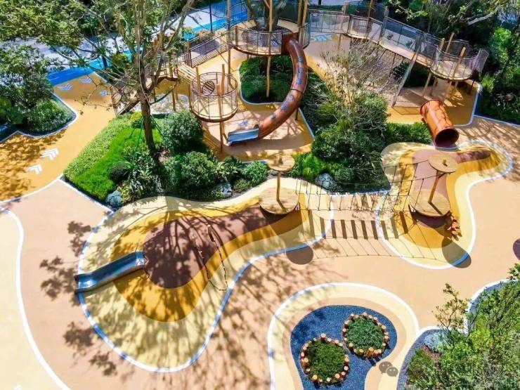 侧重娱乐、活动与交友功能,设置了滑滑梯、平衡桥、梅花桩、跳远、跳格子等儿童设施,让小孩可以快乐成长、轻松交友。