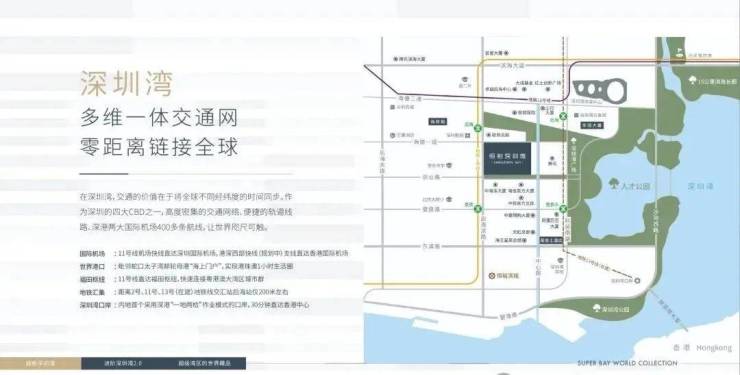 交通方面:恒裕深圳湾项目距离2号、11号地铁线交汇站后海站不远,可通过11号线直达福田枢纽,快速连接粤港澳大湾区城市群,同时11号线是机场快线,可直达深圳国际机场,还有港深西部快线支线直达香港国际机场。