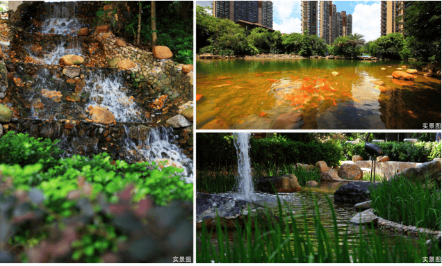 项目内部打造了一条沿着台地蜿蜒的溪流,该水系为市面罕见的活水溪流,贯穿整个社区园林,依据溪岸的曲直不同和地形变化,打造叠水、溪流、瀑布、水潭等多样特色水景,溪岸植物种类繁多,与水流互为风景,沿岸专门设置不同的亲水平台,营造自然灵动的栖心之境。
