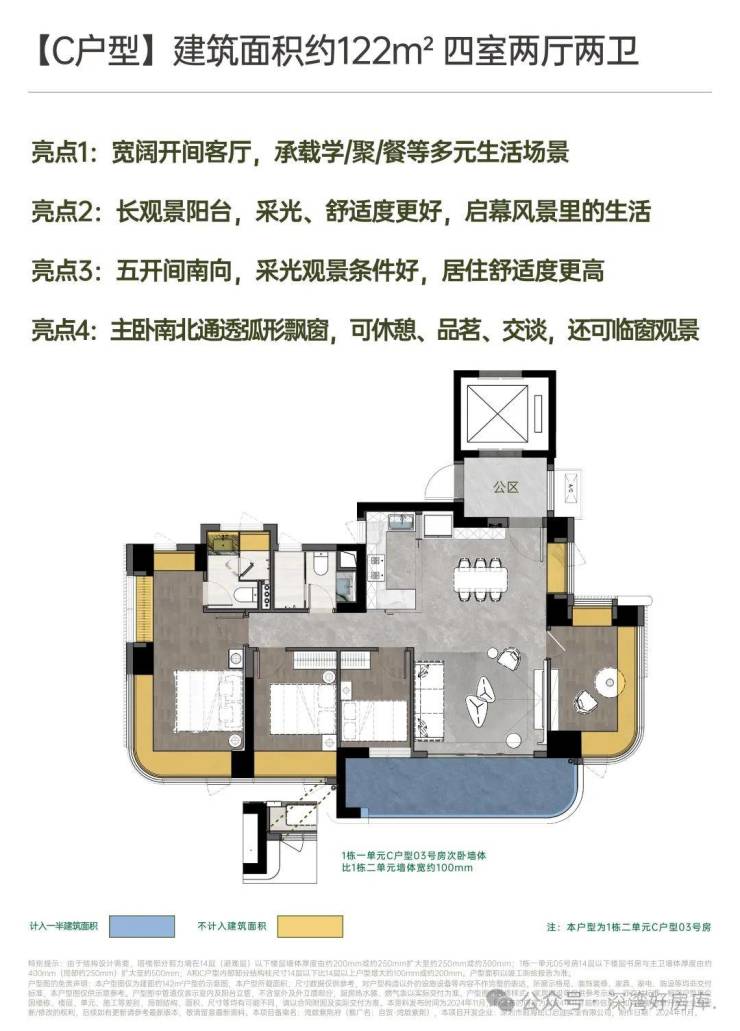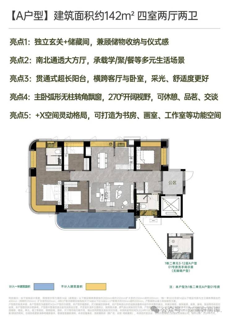 建面约142㎡南北方厅 阔景四房;