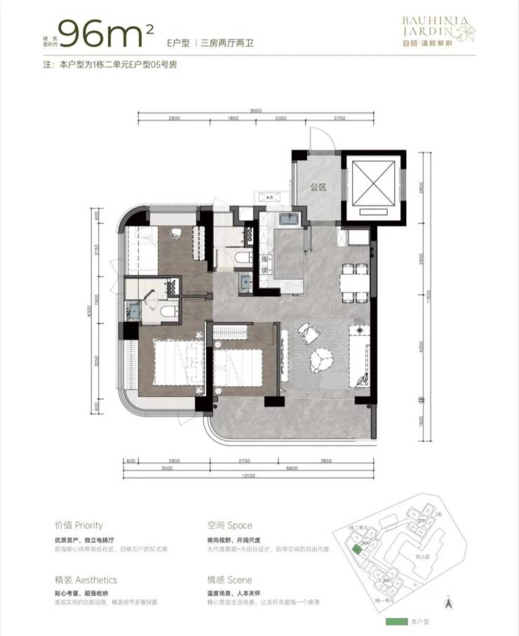 96m²E户型三房两厅两卫: