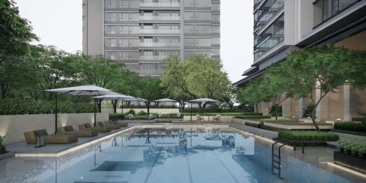 【自然水岸游泳池】:约400㎡无界亲子多元互动型泳池,与7栋架空层联动,在架空层内布置淋浴更衣、消毒池等功能,与周边绿化融合,无硬边界,绿植做隔断,旁边设置跌水景观。