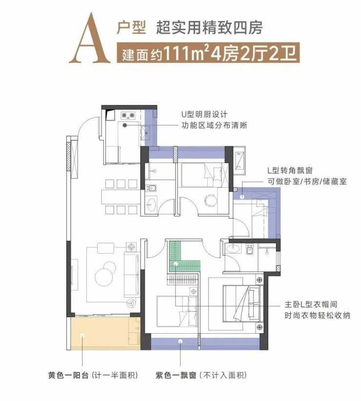 建面约111㎡竖厅4房2厅2卫,打造了极致四房,相对市面上同面积产品常为三房配置而言,为生活和兴趣多预留了“一间房”,把空间发挥到极致,在改善类型产品中难得一见。