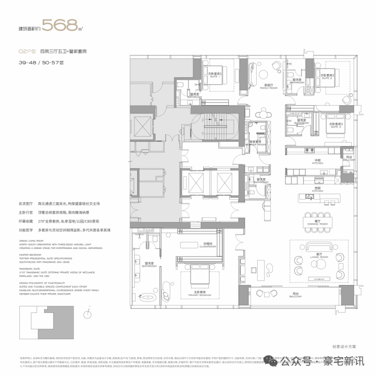 公寓主力户型为303㎡、326㎡、404㎡、572㎡等大平层,最大户型达1000㎡
