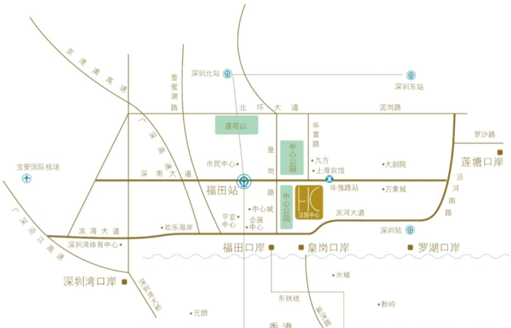 3、汉国中心屹立深南大道之上、拥享地铁1/2/3/7号线、高铁福田站、深南大道、滨河大道、组成的立体交通网络,毗邻福田皇岗双口岸、尽得深港双城的国际交通便捷、环球商机轻松掌握