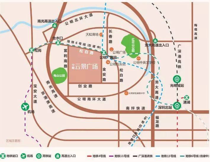 1、双地铁上盖综合体:地铁6号线、13号线(建设中)公明广场站连通地下商业,6号线已通车;