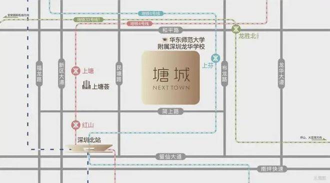 塘城NEXT TOWN(塘城壹号花园),位于龙华区上塘片区布龙路与青龙东街交汇处(上芬地铁站旁),地处龙华上塘核心区域,从大片区来看项目北侧是大浪片区,西北侧是深圳著名的阳台山公园,东侧是龙华中心区,南侧毗邻龙华红山片区,周边都是城熟的住宅小区,龙华住宅天花板-金茂府就在一路之隔,塘城NEXT TOWN位于4/6号地铁线上塘/上芬站中间区域,名副其实的双地铁口物业。