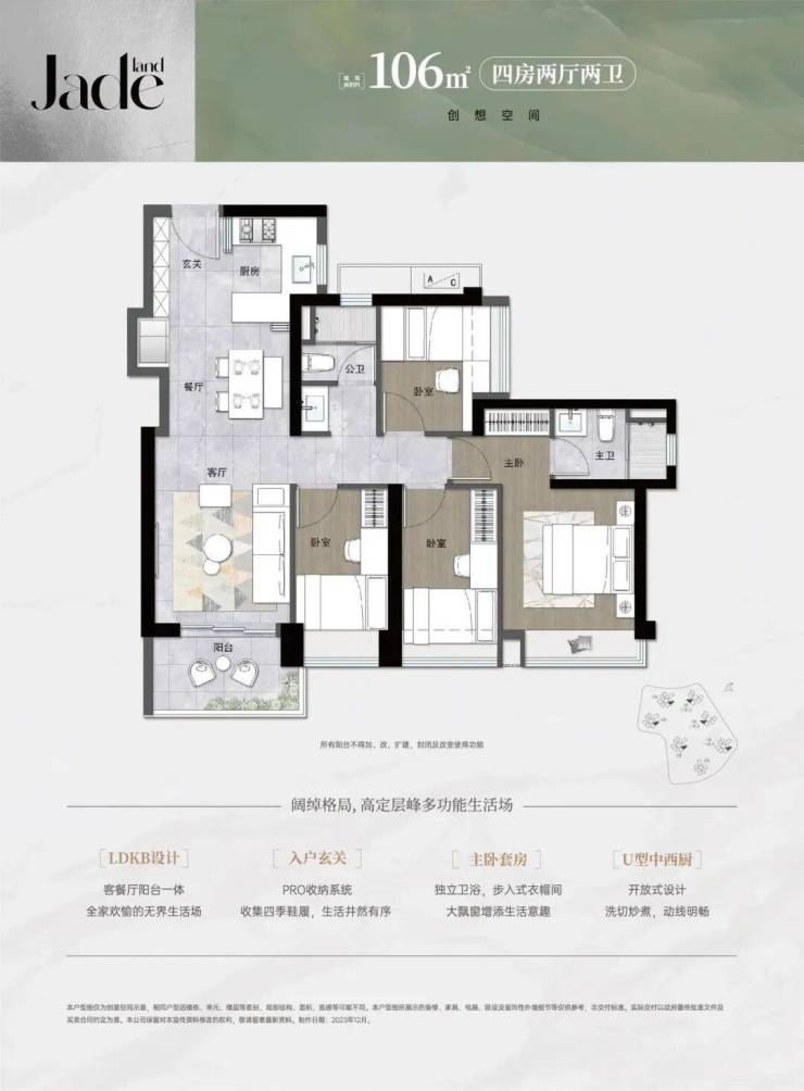 106㎡四房两厅两卫:竖厅设计,东南和西南两种朝向,适合多子女家庭或需要多房间的家庭。