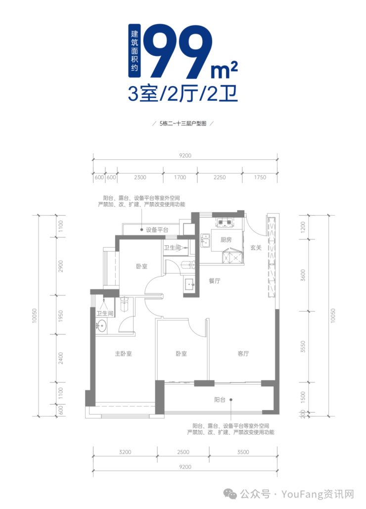 建面约99㎡三房两厅两卫