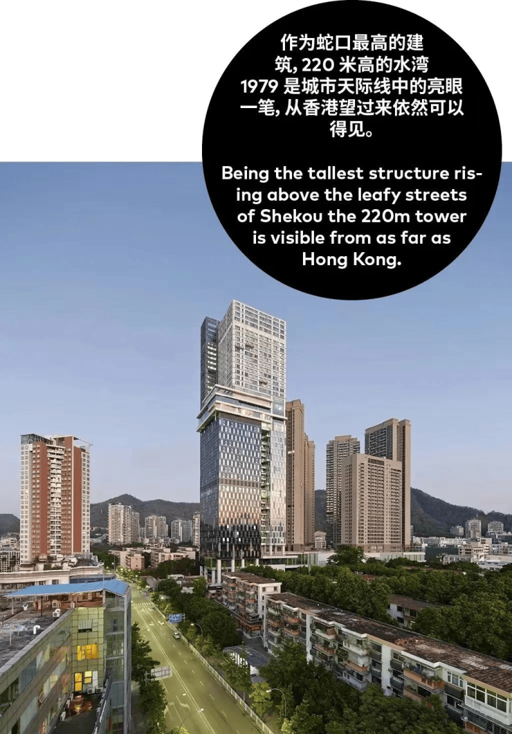 水湾1979坐落于蛇口绿树如茵的街区,地处工业六街东侧与赵山路尾端交界点,正对面是港口地标设计互联,与太子路上的水湾站地铁相连,这座220米高的商业综合体是深圳天际线中亮眼的一笔,从香港望来依然清晰可见。项目的名字致敬了邓小平先生于1979年提出的改革开放政策。如今,蛇口地区汇集了旧工厂改造而成的艺术空间、仍旧运作的现存工厂、绿地公园、老建筑区等与新兴的商业开发比肩,共同形成区域的独特风貌,依山傍海的水湾1979成为了与这个都市互动的地标性建筑。