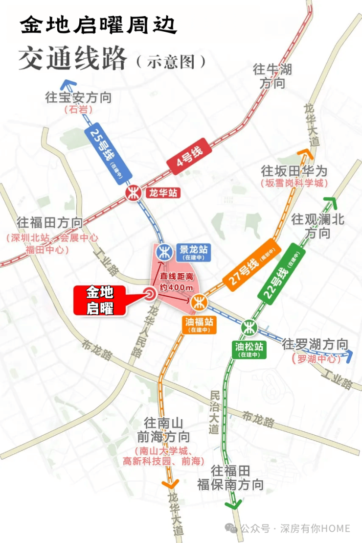 规划中的轨道交通包括:22号线油松站(距离约1.2公里,预计2028年通车,贯穿福田、龙华,5站直达车公庙);25号线景龙站(距离约400米,串联前海、西丽、龙华,强化区域与南山的联动,预计2031年开通);27号线油福站(距离约700米,覆盖龙华核心区,预计2029年通车)。