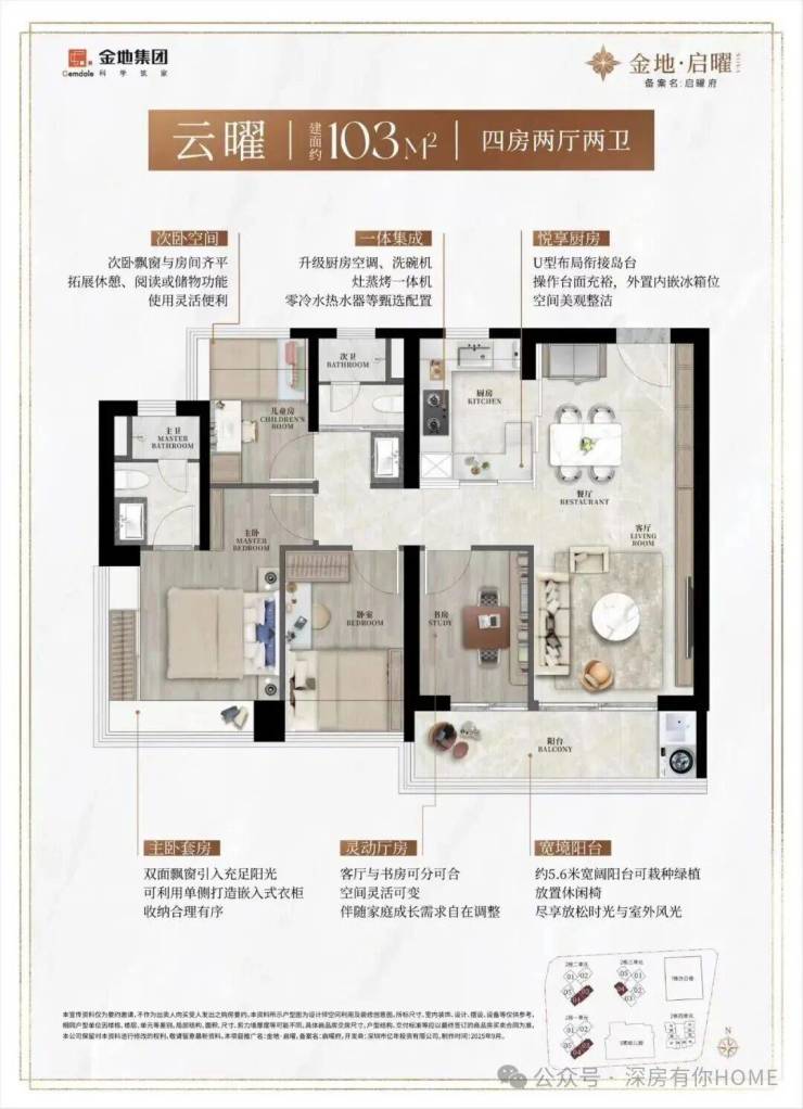 作为新规住宅的代表,金地启曜府的户型设计以高得房率、全南向布局和功能多样性 为核心亮点,得房率预计可达约90%(含赠送),实际使用面积比传统户型多出约10%。