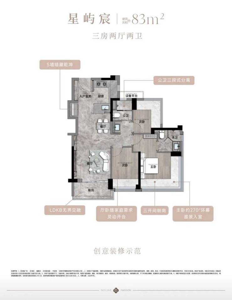 83㎡3房2卫:总价299-316万,单价3.6-3.8万/㎡;