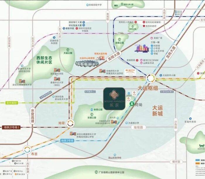 1、处于大运新城板块比较末端的区域,跟横岗交界,距离大运商业核心距离约2.2公里;