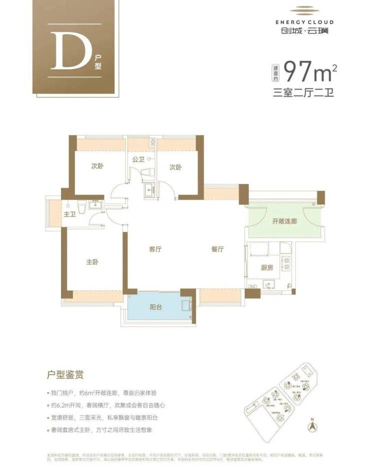 采用餐客厅一体化设计,动线更合理;主卧套房、次卧、阳台三个采光面一字排开,更通透。