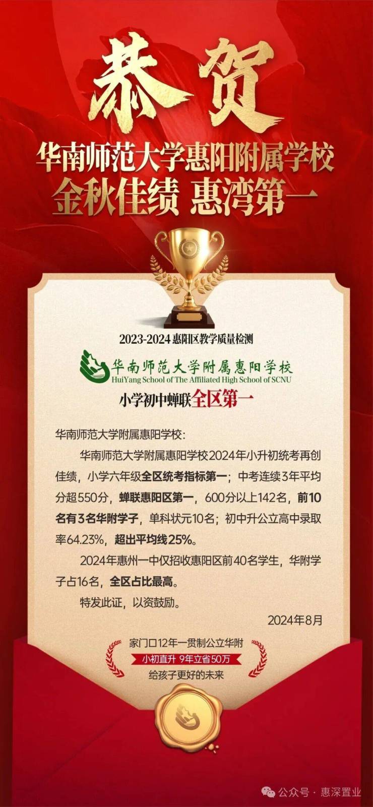 🔱【最强公立小学初中】 家门口12年制公立华附教育,2024年小升初蝉联惠阳第一,连续3年惠湾中考平均分第一;100门特色课,100%编制教师。
