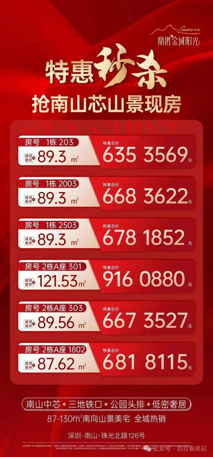 最新消息,南山留仙洞总部基地附近的鼎胜金域阳光家园现在推出工抵房85折优惠总价598万买三房,项目将推售312套房源,面积段87-130㎡2-4房。