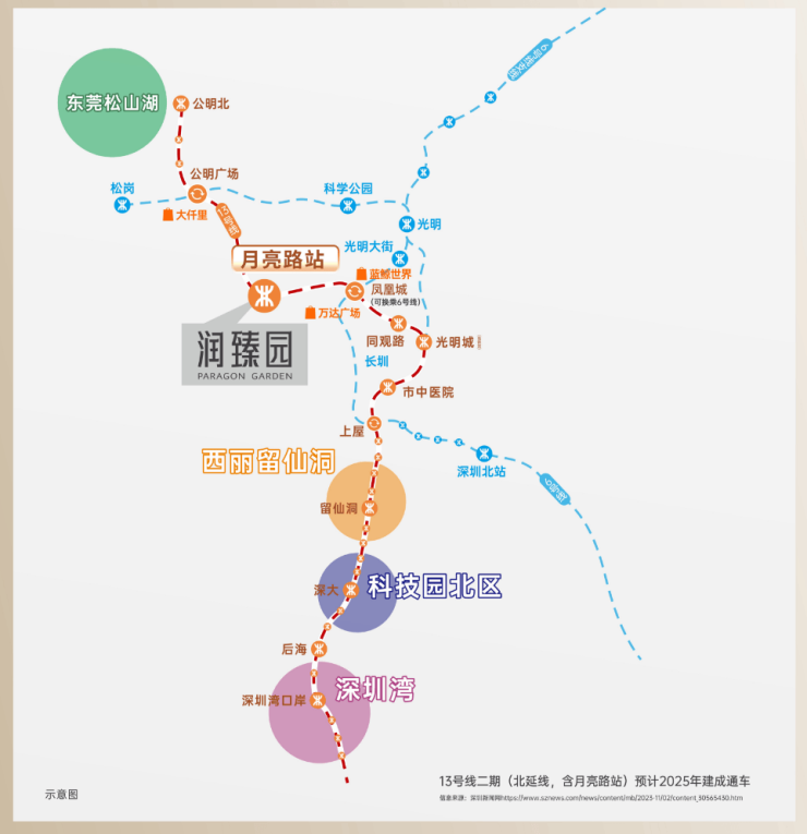 地铁交通:轨道交通直线距离约600m到达地铁13号线月亮路站(建设中),1站凤凰城,9站到南山,2025年将推动13号线二期(北延)建成通车。