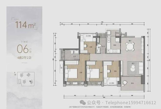 116㎡4房户型:在97㎡户型基础上多加了一个房间,客厅开间3.8m,更为阔绰。全南向户型,四开间朝南,满足四口之家或三代同堂需求。主卧双飘窗,南北通透。