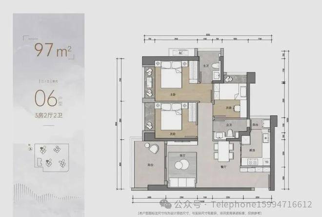 97㎡3房2卫户型:客厅开间3.6m,阳台非承重墙,可往外推,扩大公区。阳台东南朝向可看小区园林景观,西南侧则可见南山山景。户型方正,通风采光良好。厨房L型布局,与生活阳台相连,操作流畅。