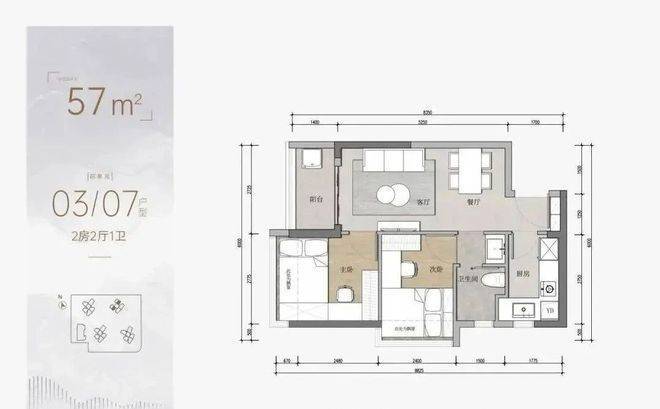 57㎡2房2厅户型:适合小两口刚需上车自住使用。客厅开间2.75m,设有独立玄关位。户型方正,竖厅设计,几乎没有不合理空间的浪费。两个卧室都有大飘窗,加上阳台的赠送,使用率较高。