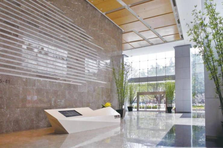 高挑空大堂,接待服务台选用纯白不规则艺术造型,让处于不显眼位置处的“中航中心”四个字变得格外抢眼。土耳其灰大理石背景墙以长短不一的斧凿凹槽线条简约呈现,搭配淡雅的色系和大理石轻奢质感石材,将艺术元素自然地引入空间。一抹亮黄色鲜花置于白色艺术服务台,瞬间点亮空间视觉。