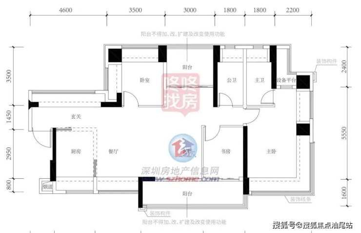 稀缺小户型产品,成长空间户型。可视为 A 户型加强版,餐厅位+1 空间可根据家庭需求做开放功能空间,也可做独立空间使 用。从而在 91 ㎡里实现四房功能空间,是深圳目前最小面积可做四房的新房,综合使用率约100%。