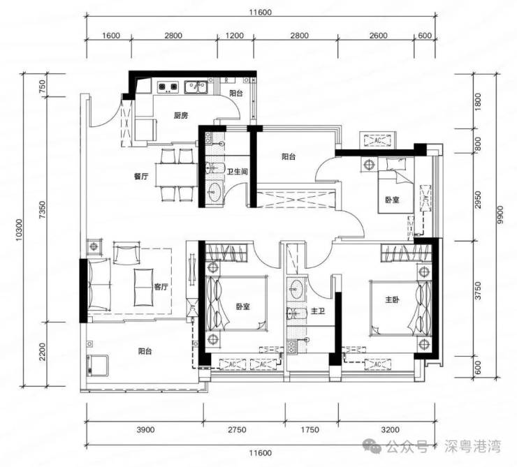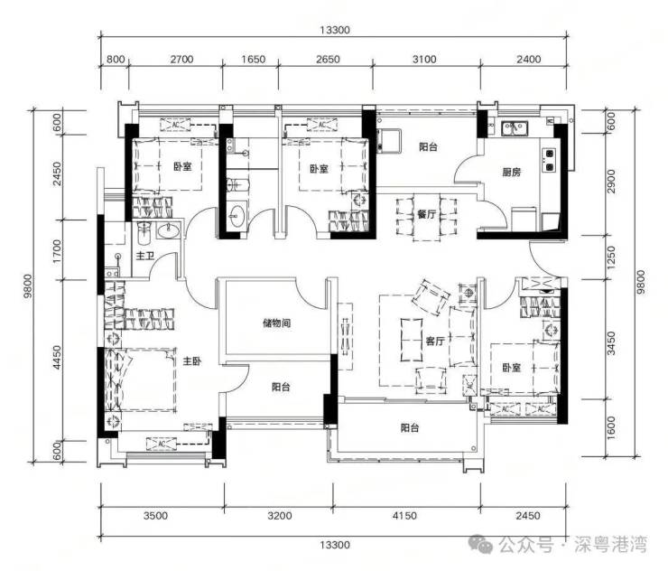 ✅ G01户型:约135㎡ 五房两厅两卫: