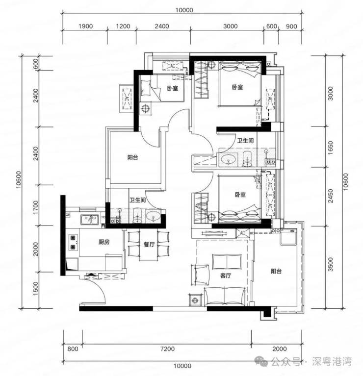 ✅ G05户型:约82㎡ 三房两厅两卫: