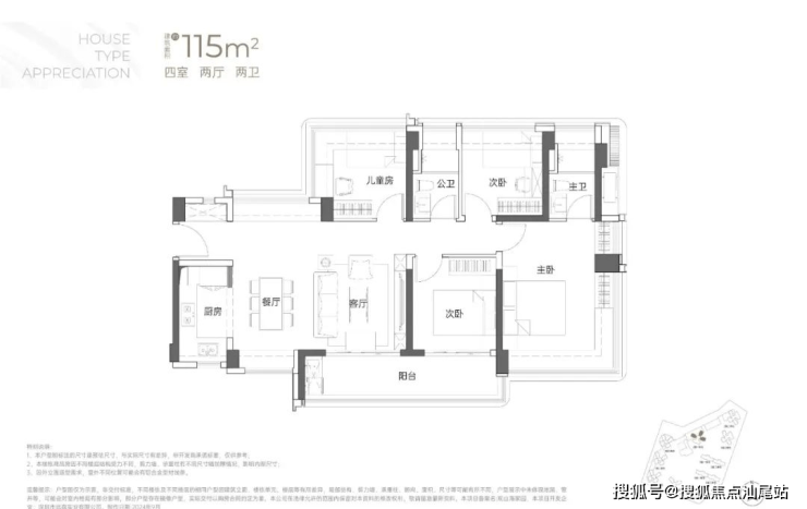 115㎡的4房2厅2卫:横厅南北通透格局,客餐厅6米开间,LDKB一体化,全屋飘窗,4个卧室分别做到了3.9米/3米/2.8米/2.6米的宽度,主卧加1个次卧270°全景飘窗,客厅出6米长的大阳台,L型厨房,得房率约95-97%(包含赠送),西南或东南朝向。115平米户型分布在1栋1单元、1栋2单元、1栋3单元01/02户型,01户型西南朝向都是看小区外围,02户型看向小区;