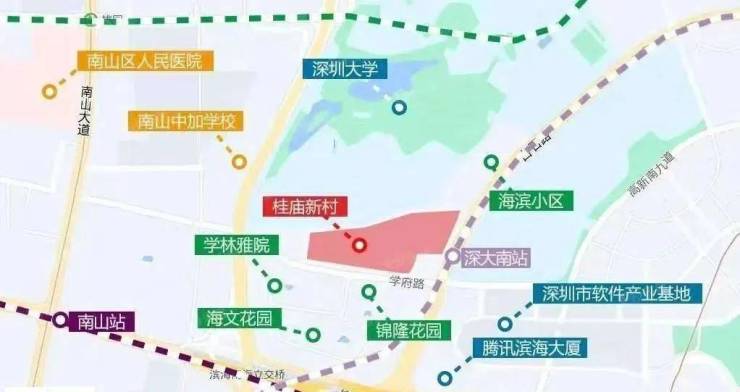 桂庙新村城市更新单元位于南山区粤海街道白石路与学府路交叉口西北侧,东临白石路,西近南海大道,南临学府路,北面与深圳大学毗邻。周边集聚了腾讯滨海大厦、软件产业基地等写字楼,地理位置优越。