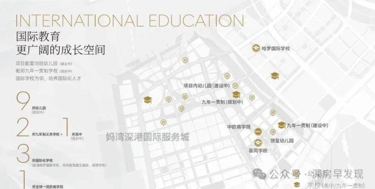 项目自带1所18班幼儿园,东南侧规划有1所九年制36班公办学校(待建),目前还没公布,大概率也是南二外集团校区,会跟紫荆府同步交付;另外在东南侧距离700米处有一所南山第二外国语学校创新学校妈湾校区(在建,预计明年首届招生)。