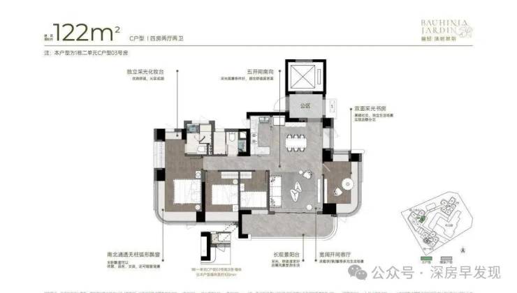 122㎡的4房2厅2卫,设计的是竖厅双龙抱珠格局,专梯入户有独立公区,五开间朝南,主卧大套间无柱弧形270°转角飘窗,得房率约92-100%(包含赠送),西南或东南向。