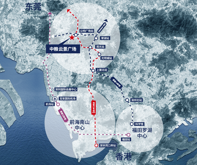 中粮云景广场毗邻公明广场站,6号线/13号线(在建)于此交汇,6号线已通车,双轨串联福田、南山、龙华、光明四区的重点板块;南光、龙大双高速免费通行,便捷通达南山、福田中芯;双轨枢纽起速,多维交通纵横,匹配高净值人群办公高效需求,为企业与员工开启高效商务时刻。