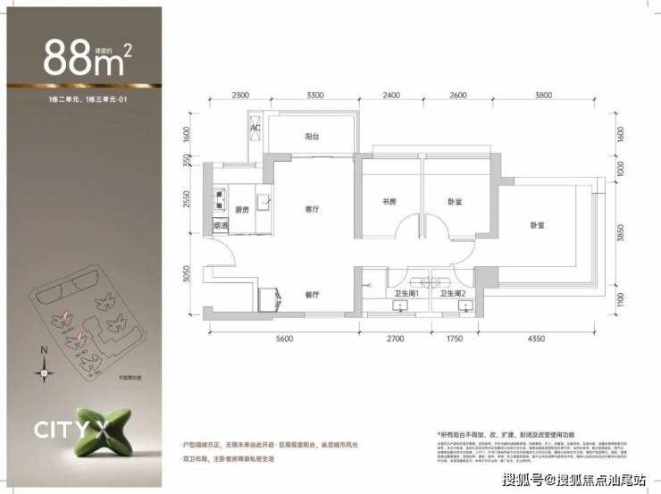 户型方面,包括建面约88㎡、98㎡3房2卫,和建面约108㎡、117㎡4房2卫。