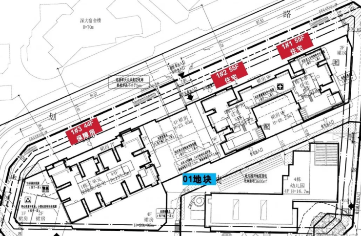 01地块:占地约1.8万㎡,建面约17.3万㎡,容积率9.28。住宅约8.9万㎡,商业约3.2万㎡。规划为3栋超高层塔楼住宅+1栋幼儿园,1栋1、2单元55层,1栋3单元44层。