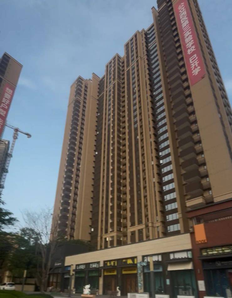 3、建筑外立面 颜色是浅棕和深棕色搭配,偏中式风格,美观度只能说中规中矩,楼栋采用新型铝膜工艺一体浇灌成型,没有槽钢和腰线层,这一点可以打7分。