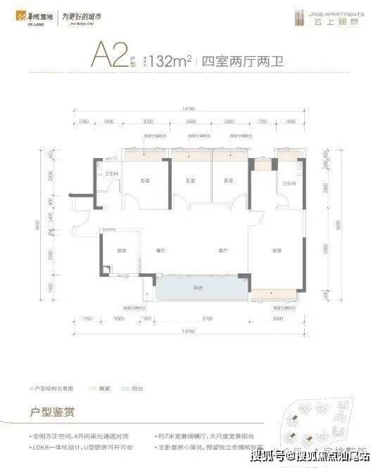 A2户型:横厅南北通透格局,客餐厅6.1米开间,主卧大套房设计,得房率82.83%,阳台主朝东南向。