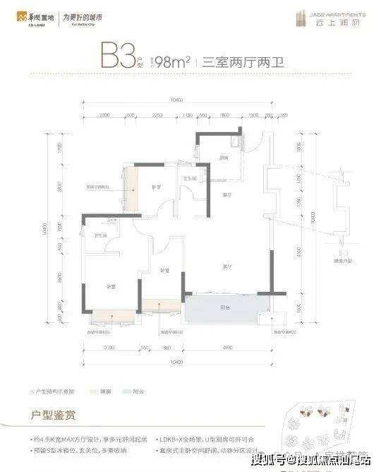 B3户型:MAX方厅设计,客厅4.9米开间,LDKB一体化+X全场景,得房率83.95%,西南或东南朝向。