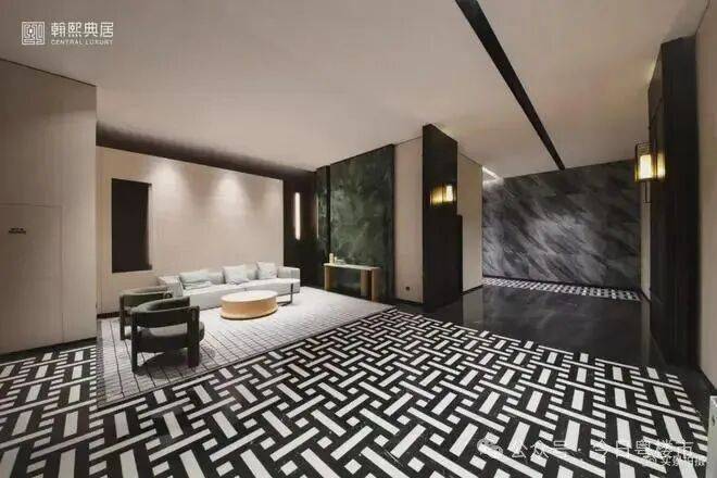 首层入户大堂,地面采用欧洲灰石材(局部黑白格纹装饰)、背景墙采用牛油果色奢石,辅以局部的深色木饰面及莱姆石石材。