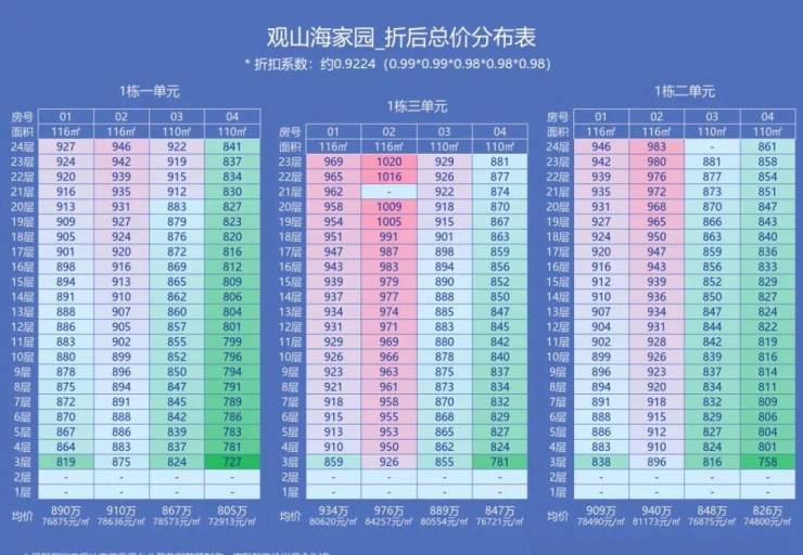 1栋1-3单元尚有少量房源,110平方米户型折后总价818-938万,115平方米户型901-978万。