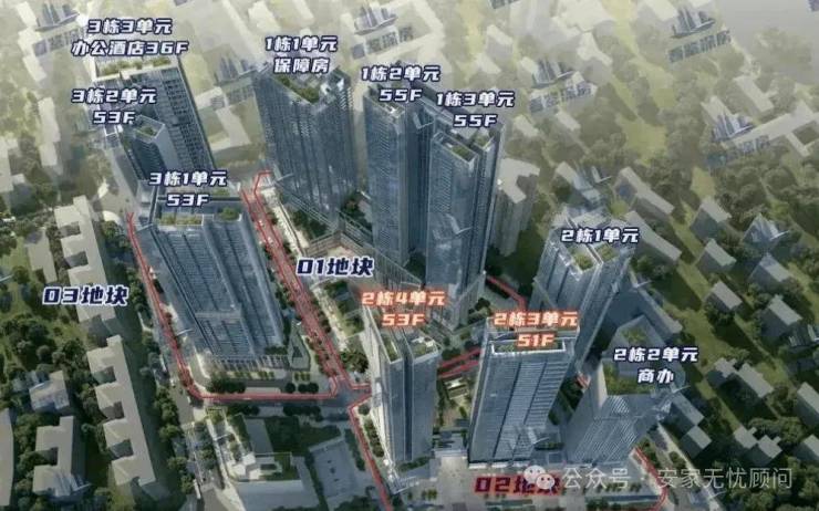 规划为3栋超高层塔楼住宅+幼儿园,1栋一、二单元193米55层,1栋三单元为保障房157米44层。规划1038套,其中保障房612套+回迁179套+可售247套,停车位834个。