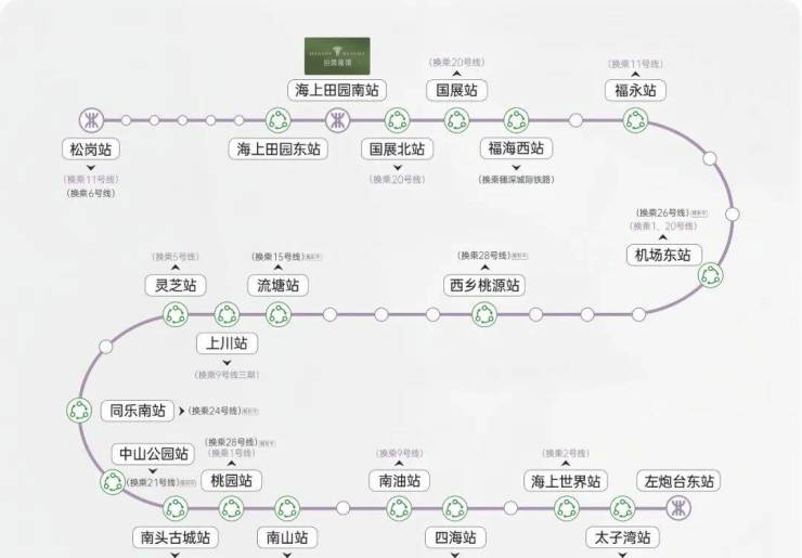 项目出门就是12号地铁线“海上田园南站”,1站到国展北可换乘20号线,5站到福永可换乘11号地铁线,公路方面,距广深沿江高速入口仅500米,15分钟直达深圳湾;深中通道30分钟可至中山,1小时通达东莞滨海湾。此外,项目步行5分钟可达福永码头,乘船30分钟直达香港中环;距深圳宝安国际机场仅8公里,适合高频差旅人群。