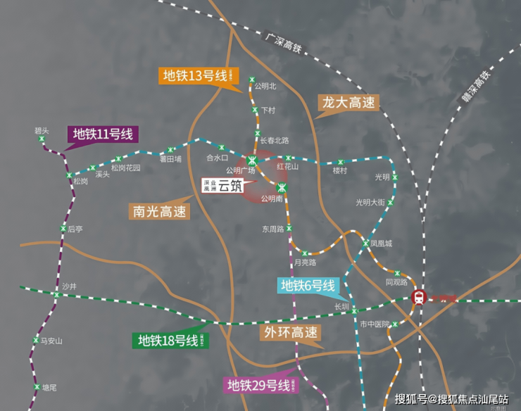 地铁配套:深业云筑2期距离在建的13号地铁线二期“公明广场站”距离1.1公里,“新庄站”(以前的公明南站)距离800米左右,另外深业云筑2期规划有公交首末站,可以快速接驳地铁站;现有的6号地铁线“公明广场站”距离有1.6公里,步行需要24分钟。