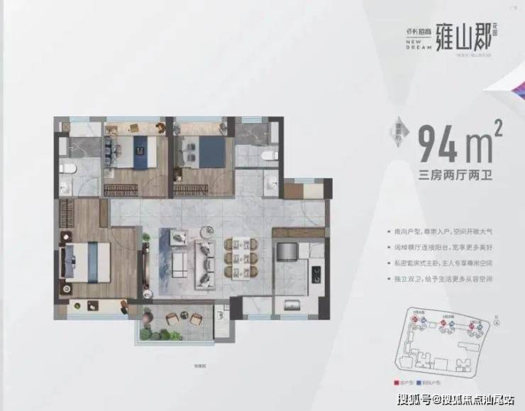 94㎡的3房2厅2卫,设计的是横厅格局,进门独立玄关,客餐厅一体化,U型厨房,公卫三段式分离,得房率:70.9%(不含赠送),阳台朝西南或东南向。
