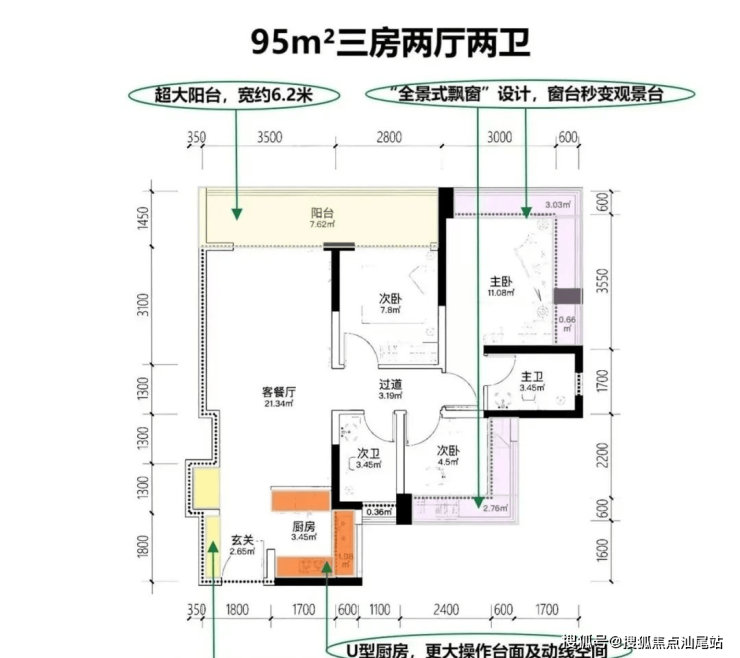 95㎡的3房2厅2卫,设计的是竖厅格局,客厅3.5米开间,LDKB一体化,S墙设计预留冰箱卡槽位,3个卧室分别做到了3.6米/2.8米/2.8米的宽度,主卧加1个次卧270°全景飘窗,客厅连接次卧出6.3米长的大阳台,U型厨房,得房率约95-97%(包含赠送),西南或东北朝向。