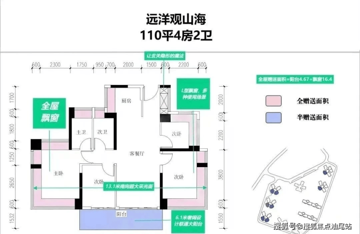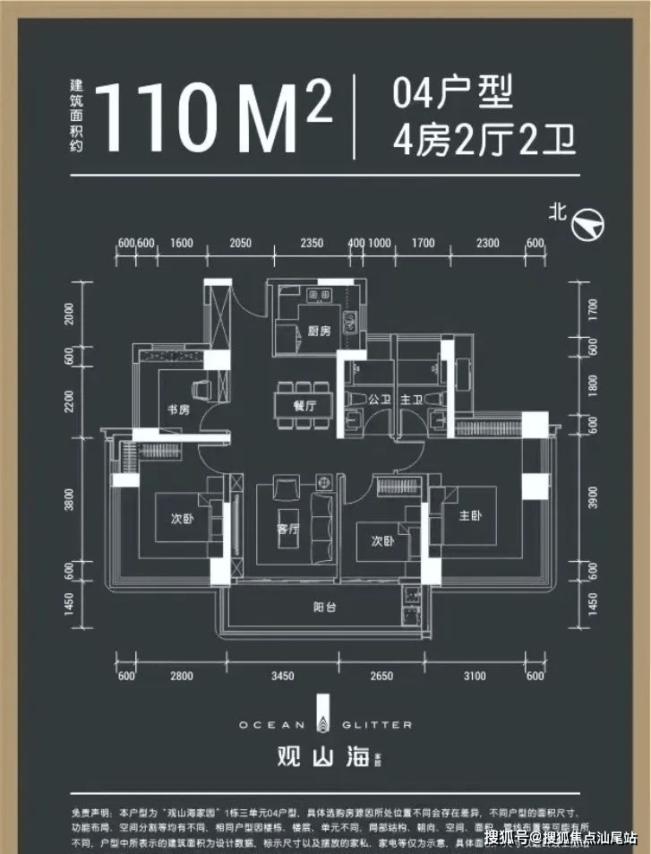 108-110㎡的4房2厅2卫,设计的是竖厅双龙抱珠格局,客厅3.5米开间,LDKB一体化,4个卧室分别做到了3.7米/3.4米/2.8米/2.6米的宽度,主卧加2个次卧270°全景飘窗,客厅连接次卧出6.1米长的大阳台,U型厨房,得房率约95-97%(包含赠送),西南或东南朝向。
