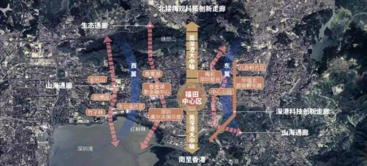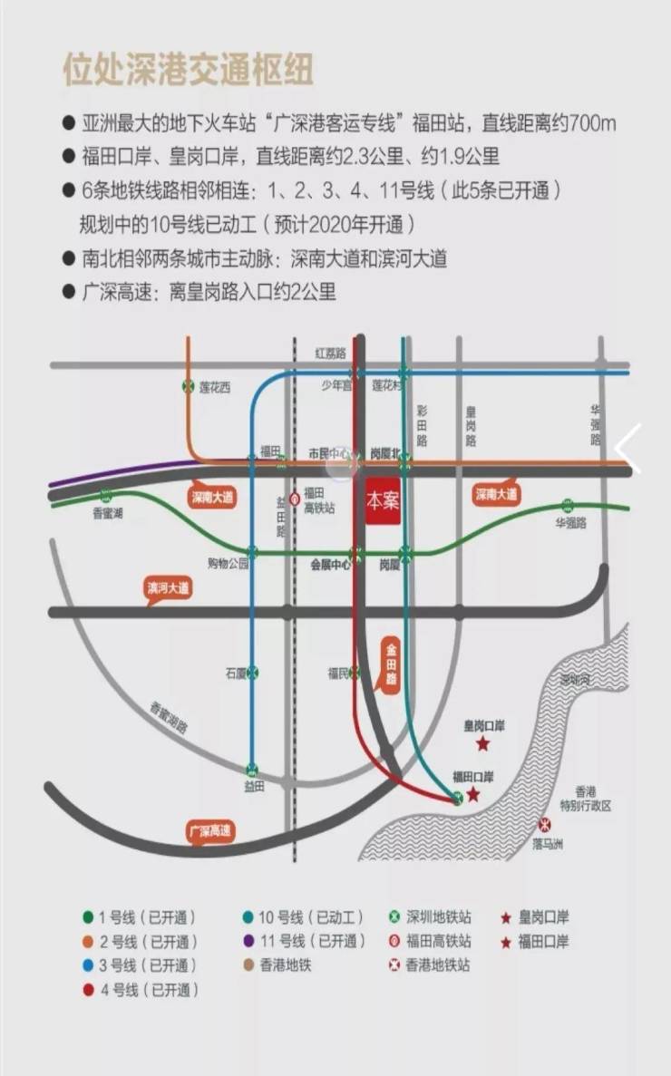 交通:高铁:福田高铁站,亚洲最大、全球通车速度最快的地下高铁站,是全球四大湾区中唯一位于城市CBD中心的高铁站