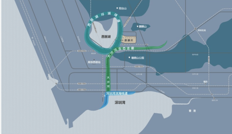 三山环抱,一湖为邻,千万顷珍稀原生资源,造就一席湖山大境;西丽湖环湖栈道+大沙河生态走廊+深圳湾环湖栈道,汇聚城市自然资源标地。